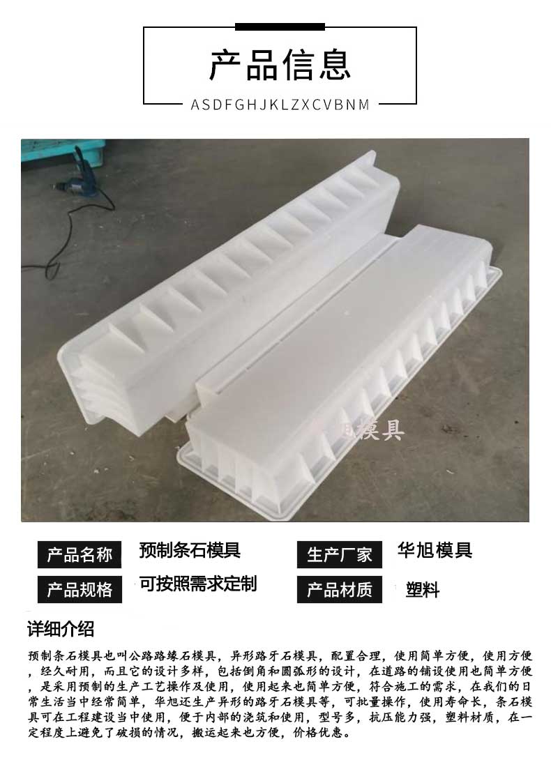 預(yù)制條石模具在綠化帶及道路的兩側(cè)使用,結(jié)構(gòu)組裝簡(jiǎn)單,可批量生產(chǎn)。