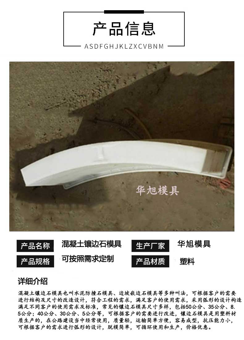混凝土鑲邊石模具形狀簡單,規(guī)格型號齊全,可循環(huán)使用,符合施工單位的需求。