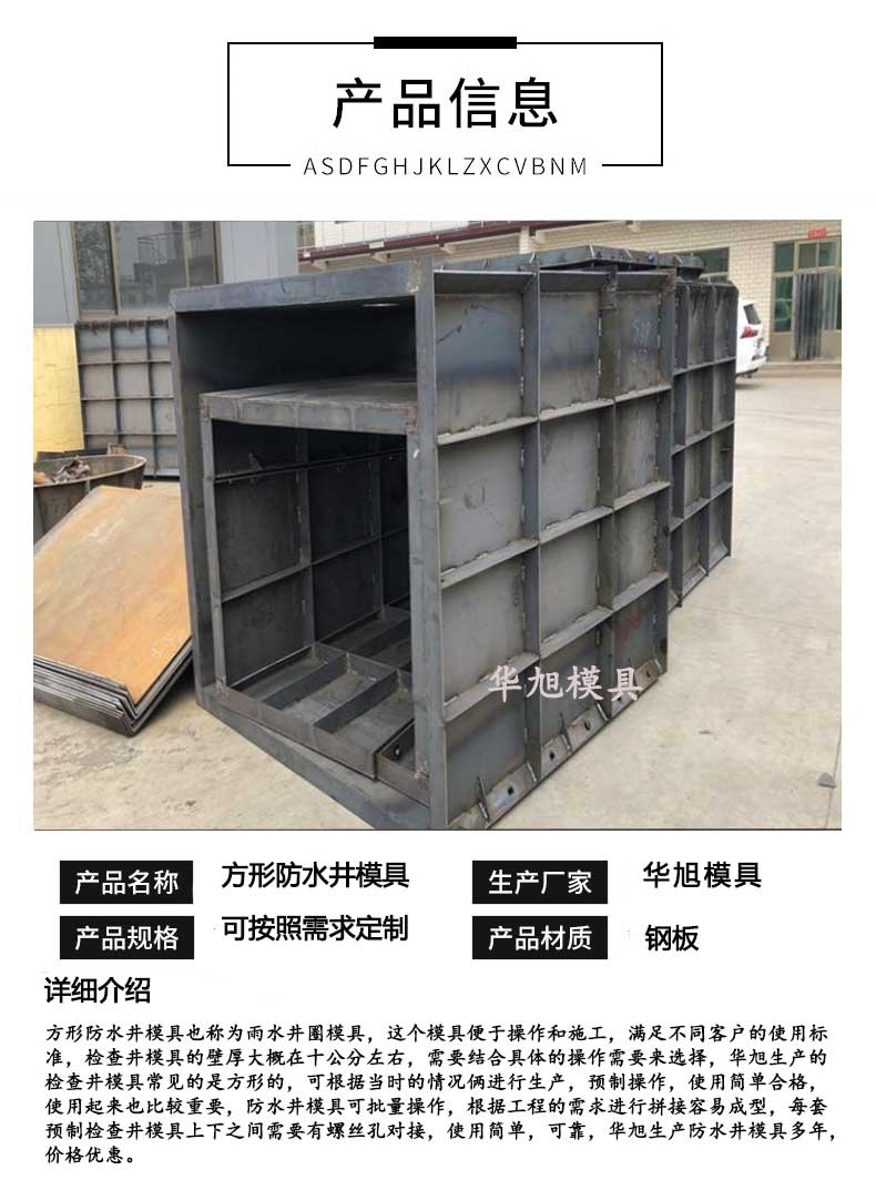華旭生產(chǎn)方形防水井模具、雨水井圈模具多年,預(yù)制操作,可反復(fù)使用,便于施工,滿足不同施工周期,符合施工現(xiàn)場(chǎng)的需求,可按照需求定制,生產(chǎn)簡(jiǎn)單,表面光滑,外形美觀,深受市政的歡迎。