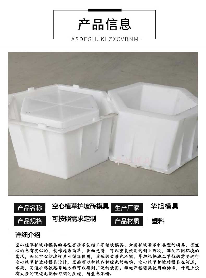 空心植草護(hù)坡磚模具循環(huán)制作,使用時(shí)間長(zhǎng)達(dá)三年,使用簡(jiǎn)單方便。